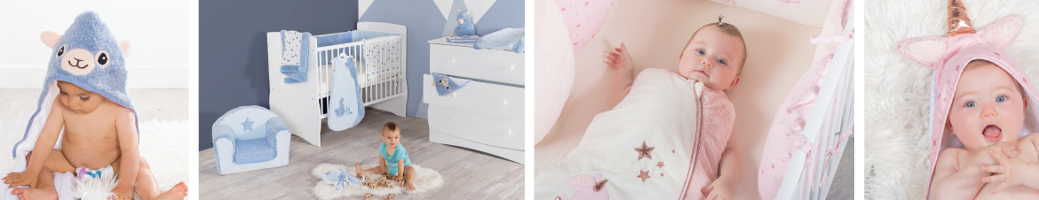 Domiva, marque spécialisée depuis plus de 30 ans dans la décoration de la chambre de bébé, offre à chaque enfant, une aventure merveilleuse en proposant des environnements de chambre coordonnés conçus spécialement pour eux. Nos collections sont entièrement créées par l’équipe de création Domiva, soucieuse d’offrir des produits adaptés aux besoins de l’enfant. La sélection des matières pour le confort, le choix des couleurs pour l’éveil et la déco, la qualité de la confection pour la sécurité, sont autant de points vérifiés et d’étapes nécessaires à l’élaboration de nos collections afin de garantir le meilleur à nos tout-petits. Chaque collection propose de multiples articles assortis pour créer des univers de chambre merveilleux : tour de lit, gigoteuse, nid d’ange, doudou, caisse de rangement, couverture, mobile musical, peluche, matelas à langer, sortie de bains etc… Des couleurs tendres, des matières douces, des personnages attachants, font de nos collections de chambre des histoires magiques pour accompagner bébé dans ces plus beaux rêves.